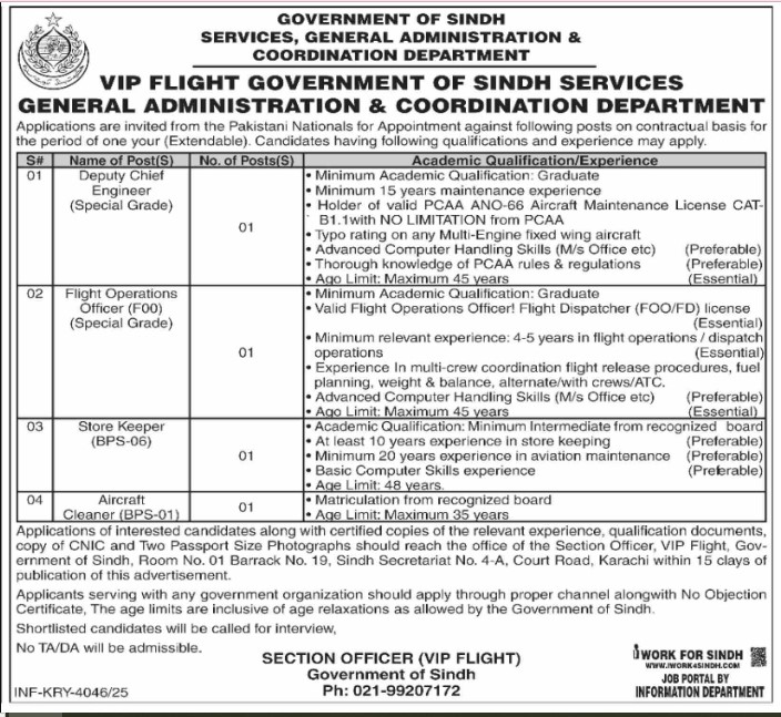 Only male candidates can apply for General Administration And Coordination Department Jobs In Sindh 2025 Qualification /Experience Required:Minimum Academic Qualification: Graduate Minimum 15 years maintenance experience Holder of valid PCAA ANO-66 Aircraft Maintenance License CAT- B1.1with NO LIMITATION from PCAA