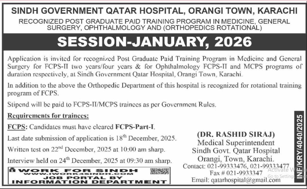 Candidates if you are seeking General Surgery And Training Medicine Jobs In Karachi December 2025 if yes. It would be best if you tried to complete read General Surgery And Training Medicine job because you can easily apply for these vacancies SURGERY, OPHTHALMOLOGY AND (ORTHOPEDICS ROTATIONAL). Only male candidates can apply for General Surgery And Training Medicine Jobs In Karachi December 2025 Qualification /Experience Required:In addition to the above the Orthopedic Department of this hospital is recognized for rotational training program of FCPS.Stipend will be paid to FCPS-II/MCPS trainees as per Government Rules, and more experienced candidates should apply before 24 December 2025.