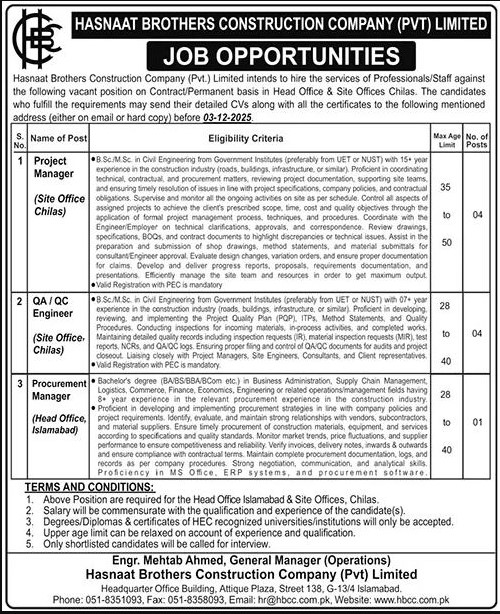 Only male candidates can apply for Hasnaat Brothers Construction Company Jobs In Islamabad December 2025 Qualification /Experience Required:B.Sc./M.Sc. in Civil Engineering from Government Institutes (preferably from UET or NUST) with 15+ year experience in the construction industry (roads, buildings, infrastructure, or similar). Proficient in coordinating technical contractual, and procurement matters, reviewing project documentation, supporting site teams, and ensuring timely resolution of issues in line with project specifications, company policies, and contractual obligations. Supervise and monitor all the ongoing activities on side as per schedule. Control all aspects of assigned projects to achieve the client’s prescribed scope, time, cost and quality objectives through the, and more experienced candidates should apply before 03Â December 2025.