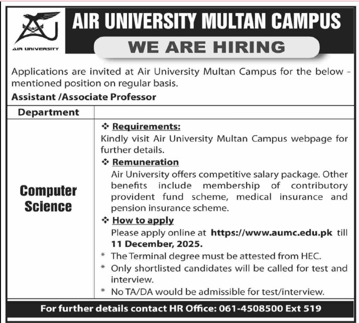 Only male candidates can apply for Multan Campus Air University Jobs In Multan, December 202.5 Qualification /Experience Required:The Terminal degree must be attested from HEC. Only shortlisted candidates will be called for test and interview. No TA/DA would be admissible for the test/interview, and more experienced candidates should apply before 11Â December 2025.