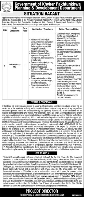 Only male candidates can apply for Planning And Development Department Jobs In Kpk December 2025 Qualification /Experience Required:Maimun MIT MCSMSc in Computer Sciences or any other relevant degree in Information Technologytom reputed HEC recognized Unversity Minimum 30 years of Age Mimum 5 years of art experience in integrated MS management, data management ored rok, and more experienced candidates should apply before 15December 2025.